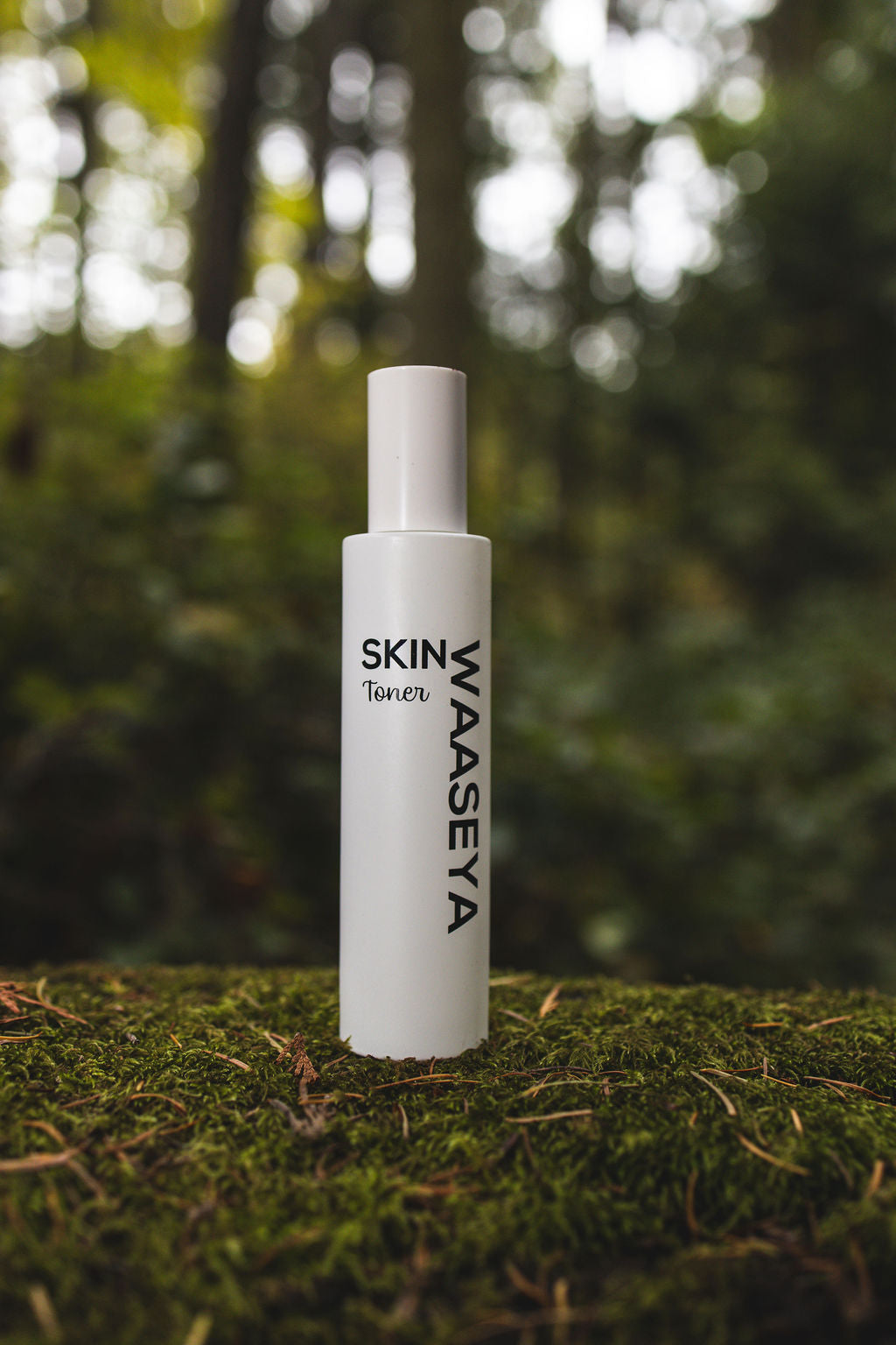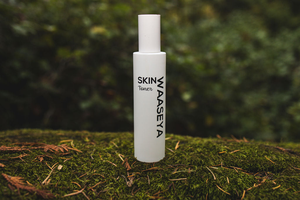 Set of Waaseya skincare products on a natural background with soil and leaves.